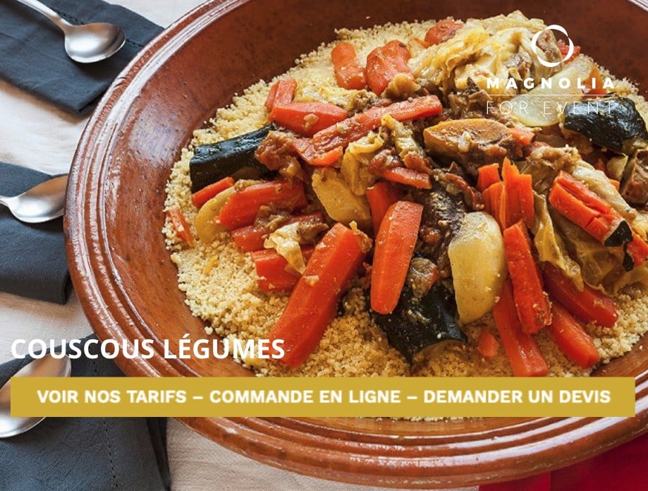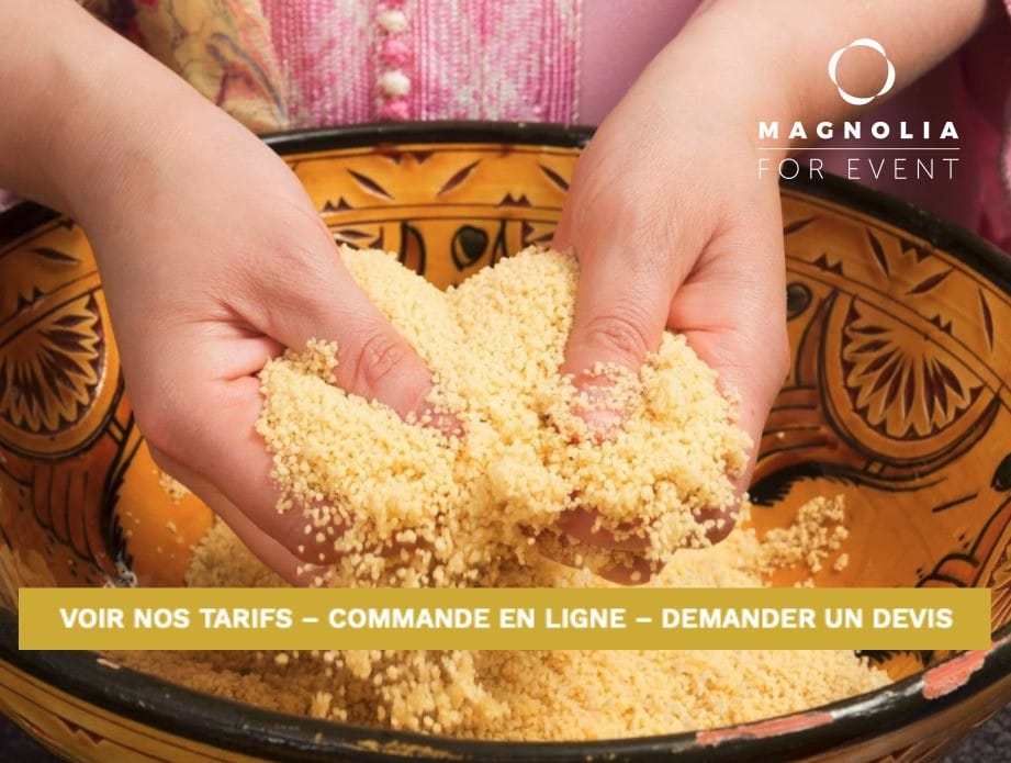 Le rôle d’un bon cuisinier est primordial dans la préparation d’un couscous traditionnel. Nous avons choisi la meilleure qualité de semoule en optant pour une taille de grain moyen qui saura répondre au plus fin des gourmets. Notre couscous sera préparé le jour de votre évènement.