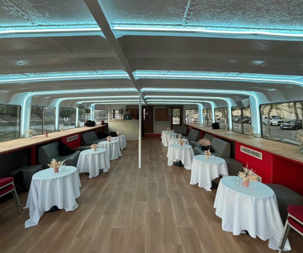 Avec une capacité de 230 personnes en format cocktail, cette sublime péniche peut accueillir 220 personnes pour dîner et 150 en mode conférence. A l’intérieur ou sur la terrasse, les aménagements possibles pour votre événement sont vastes !