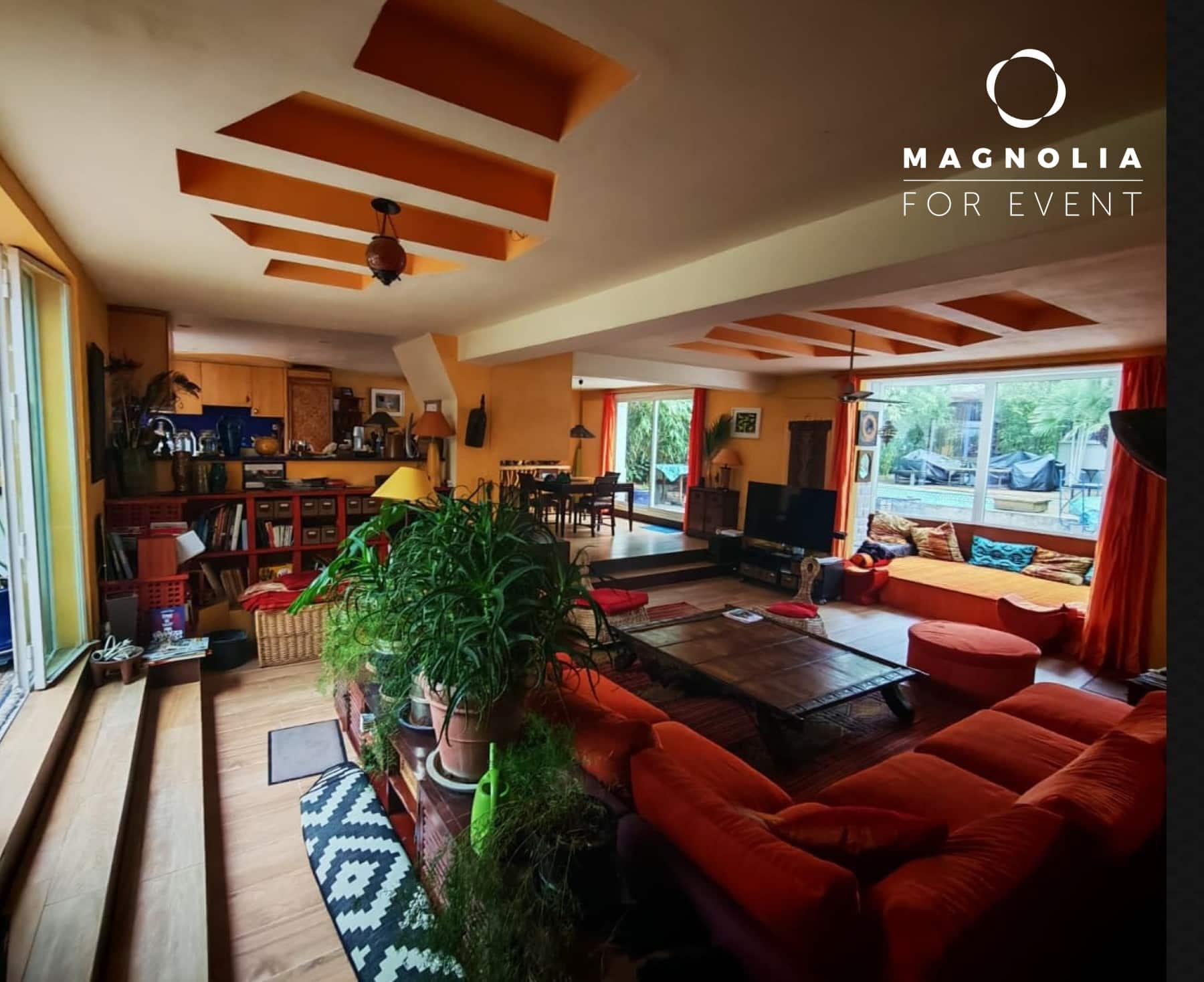 Située à Champigny-sur-Marne, la Villa Palmier est une demeure d’exception alliant architecture contemporaine et dépaysement tropical. Ce lieu signature, aux teintes terracotta et aux volumes baignés de lumière, est l’écrin idéal pour vos événements et projets créatifs.