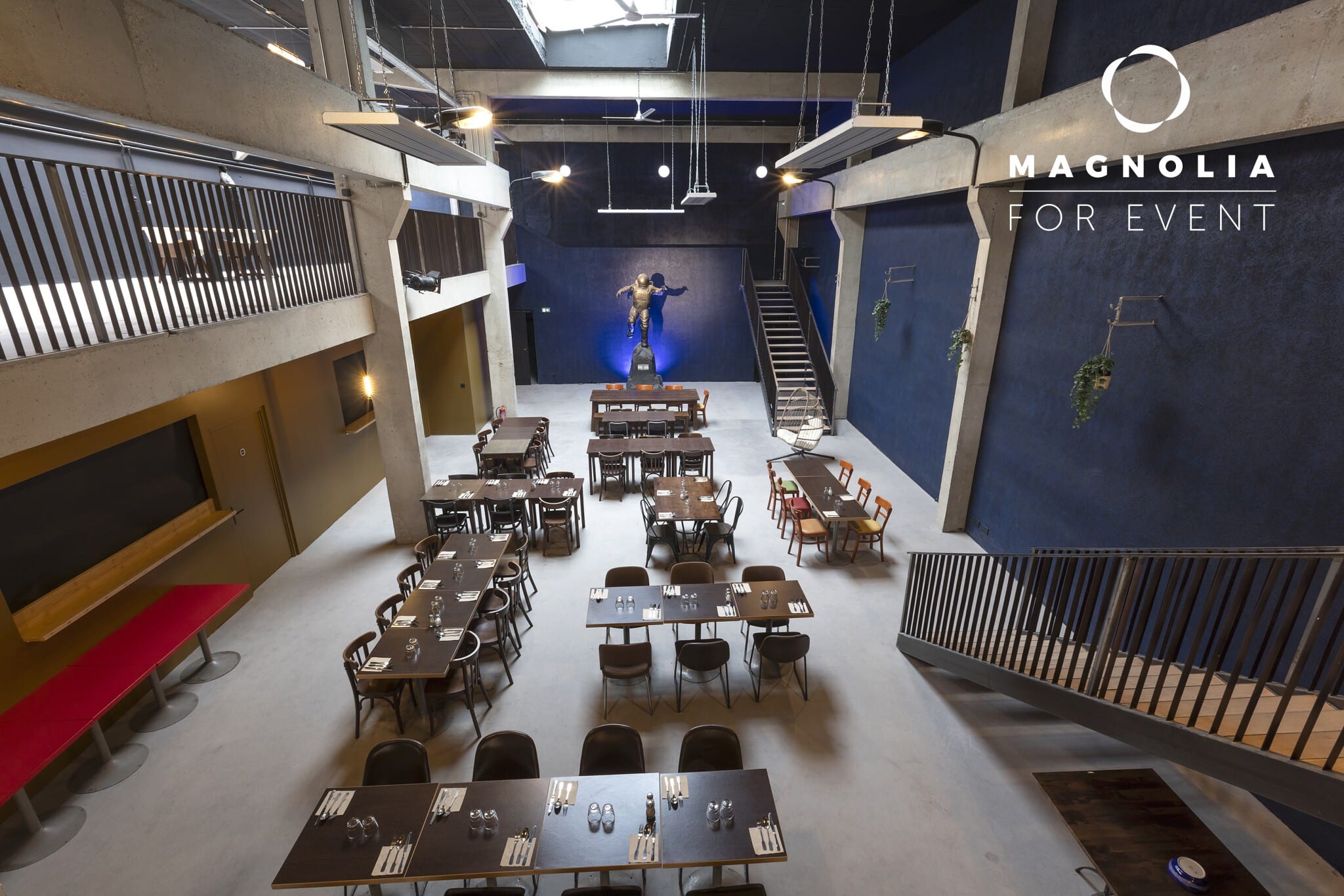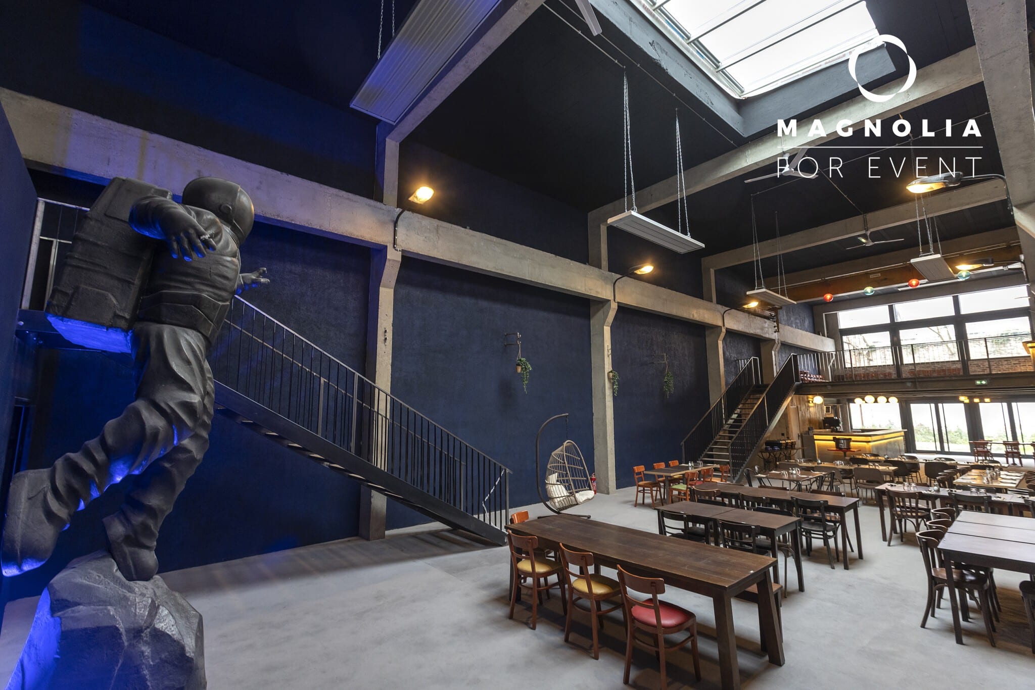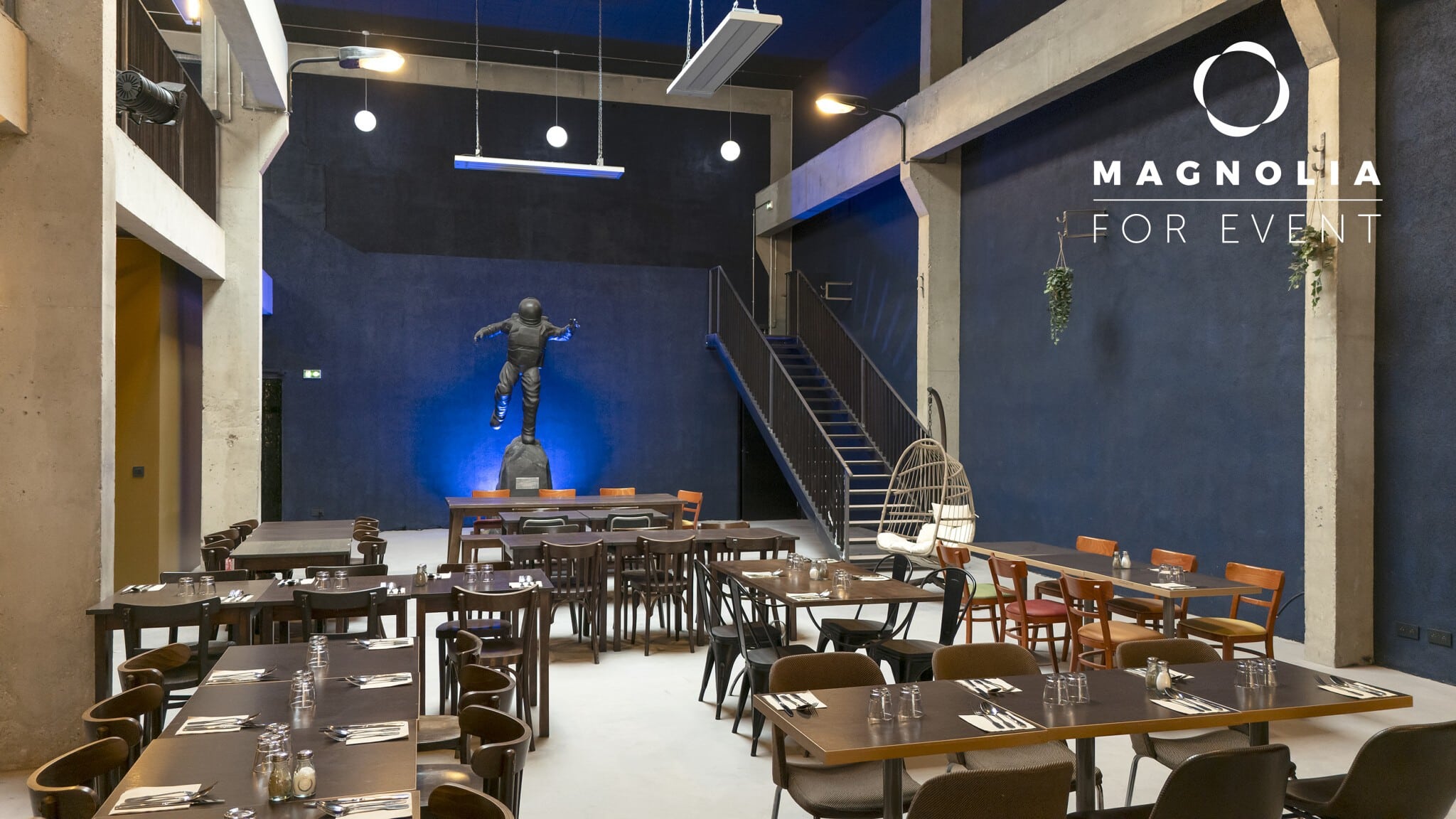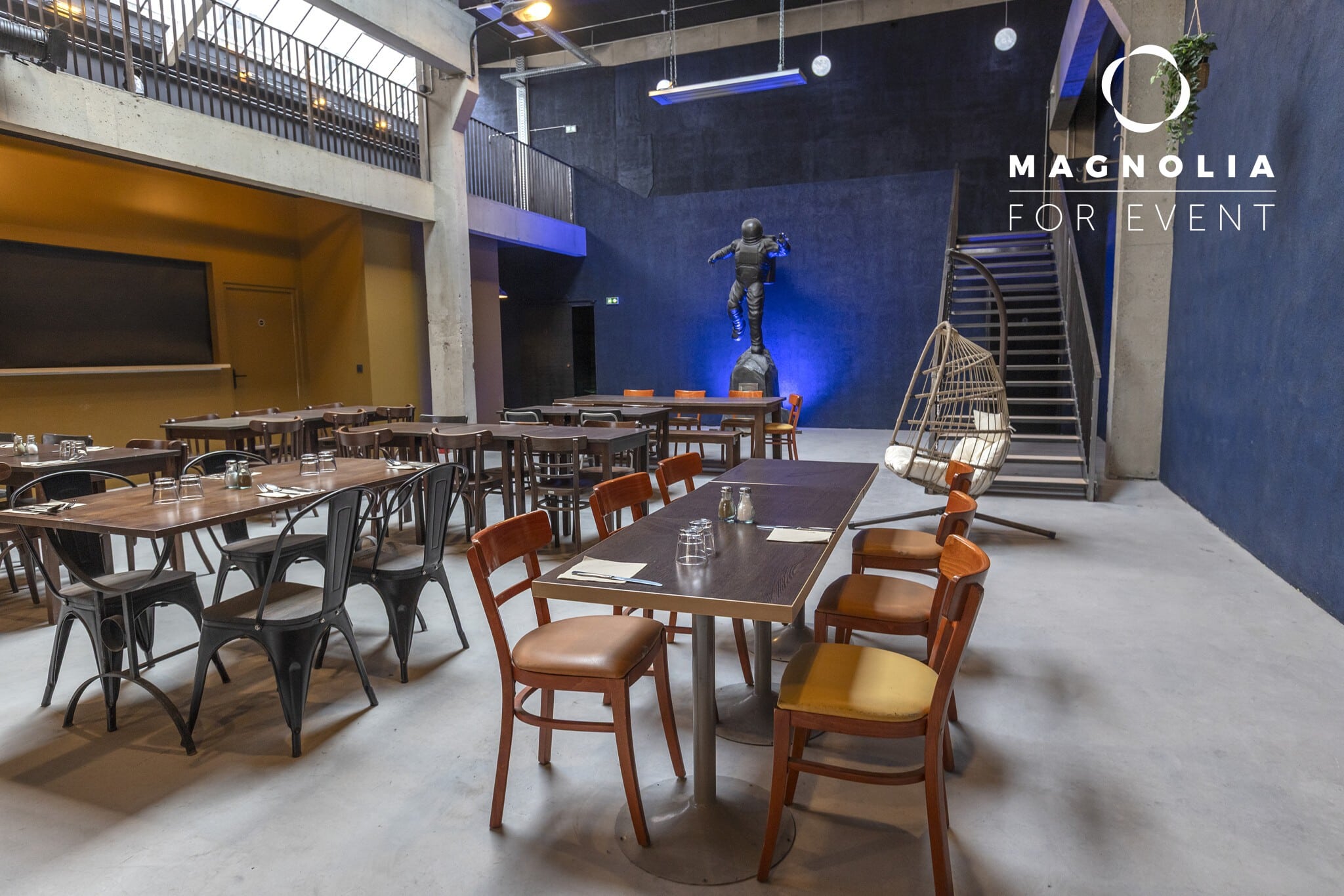 Son nom n’est pas un hasard : au cœur de la grande salle trône une magnifique statue de cosmonaute en bronze, véritable pièce maîtresse qui donne à ce lieu une identité unique et mémorable. Ce décor atypique surprend immédiatement les invités et crée une ambiance singulière qui transforme chaque événement en expérience inoubliable.
