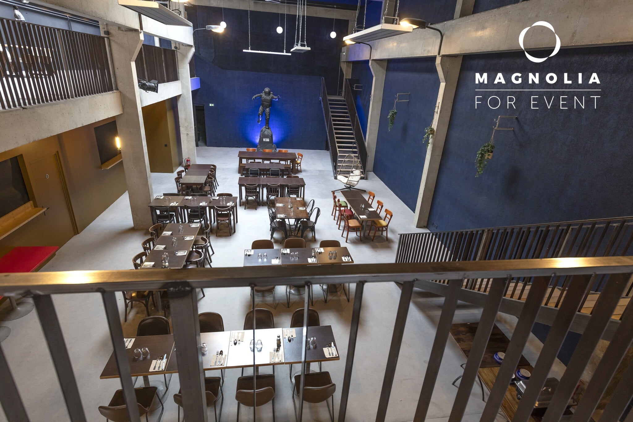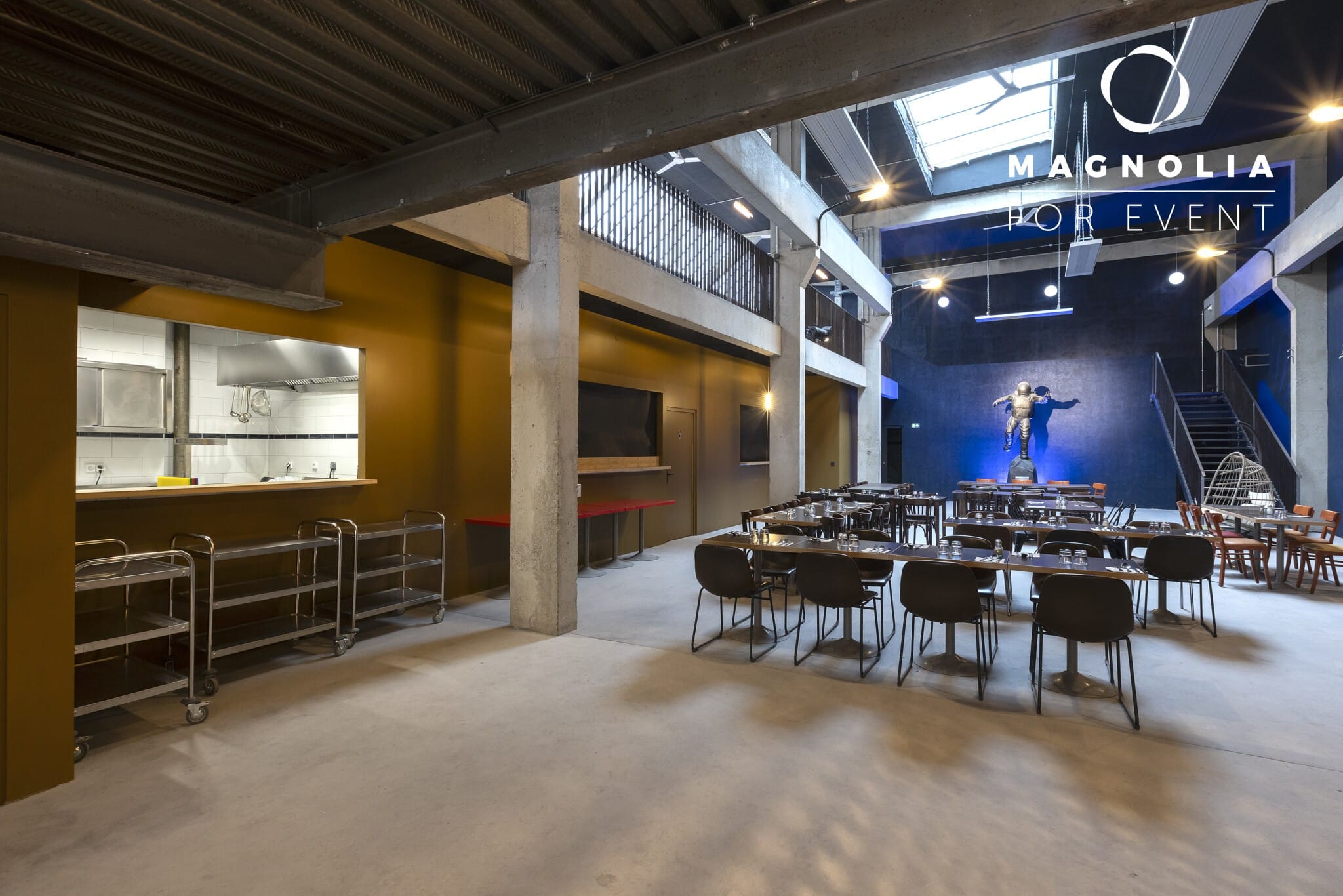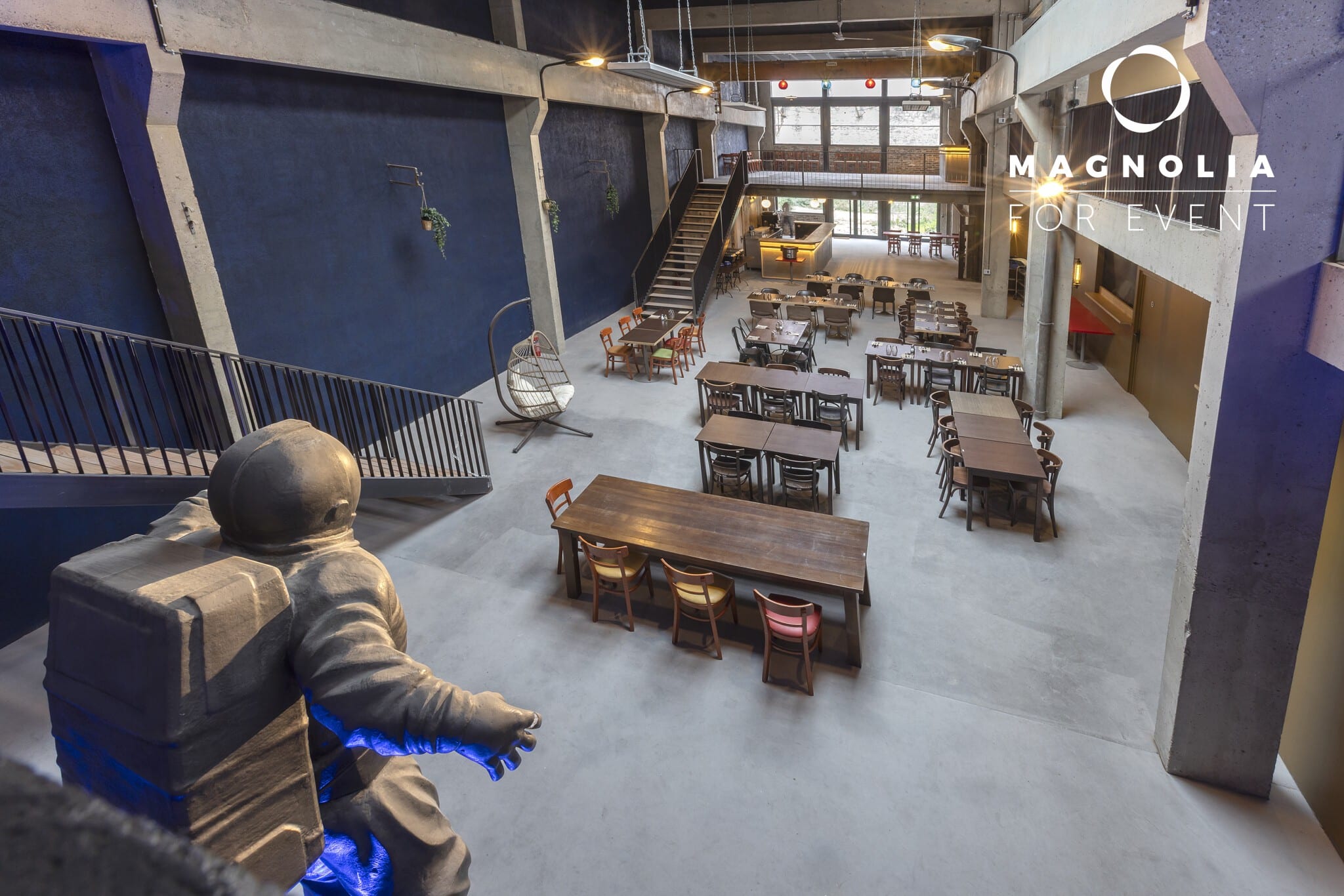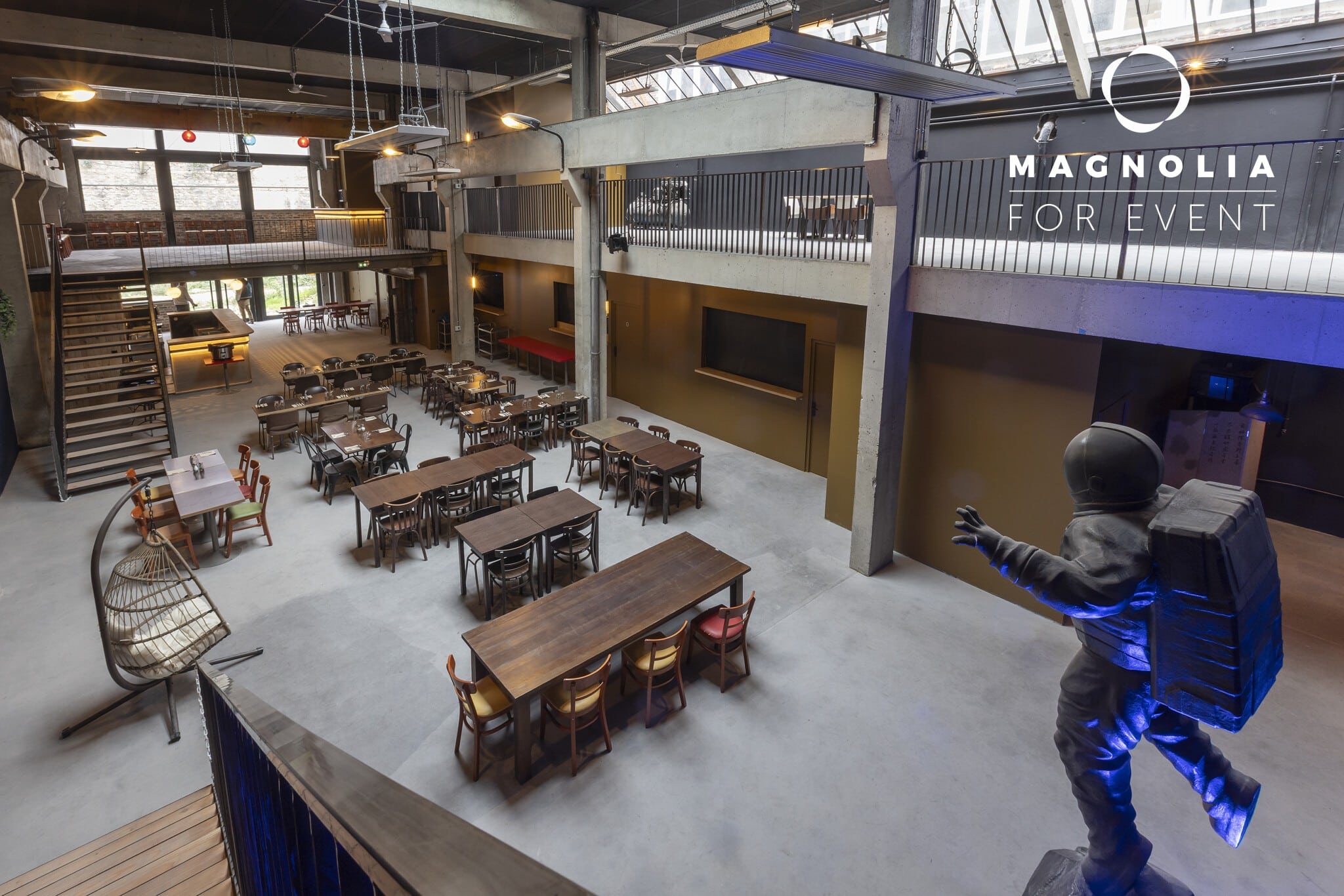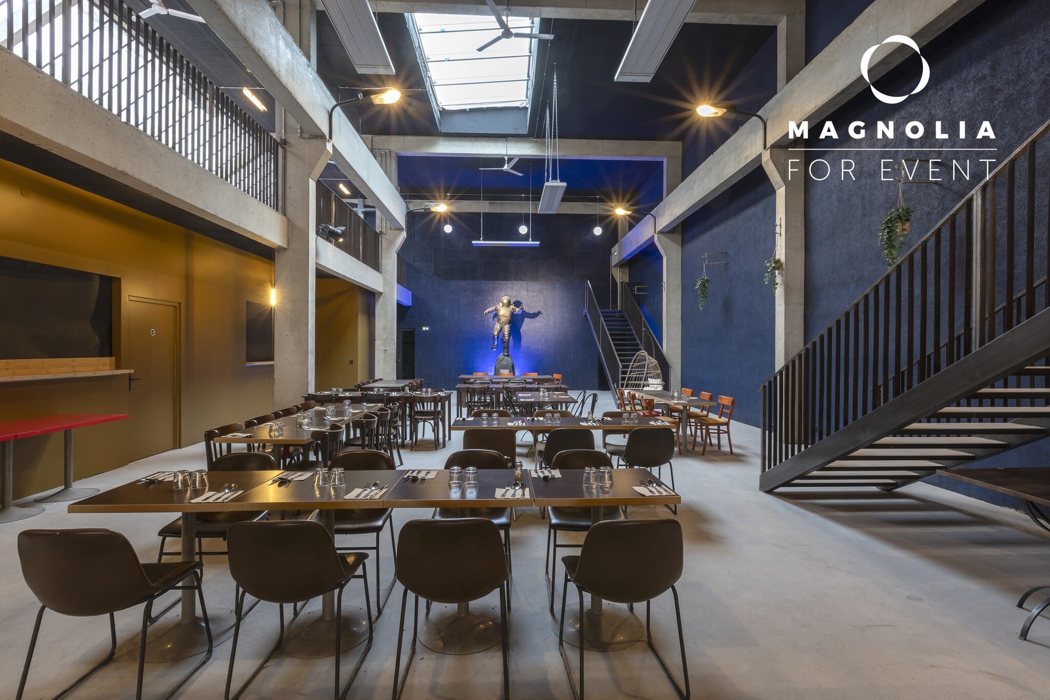 Son nom n’est pas un hasard : au cœur de la grande salle trône une magnifique statue de cosmonaute en bronze, véritable pièce maîtresse qui donne à ce lieu une identité unique et mémorable. Ce décor atypique surprend immédiatement les invités et crée une ambiance singulière qui transforme chaque événement en expérience inoubliable.
