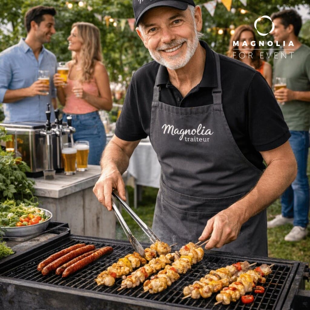 Fêtez votre anniversaire en extérieur avec notre barbecue party, une animation conviviale et clé en main idéale dès 20 personnes. Pendant 2h30, nos grilladins assurent installation, cuisson en direct et service, pour une ambiance chaleureuse. Viandes variées (poulet, bœuf, merguez, chipolatas) à raison de 350g par personne, accompagnées de pommes de terre sautées, salades et baguettes. Sauces à volonté. Le nombre de grilladins s’adapte à vos invités pour un service fluide. Profitez d’une animation interactive, de produits frais et d’une organisation sans stress pour un événement réussi, gourmand et mémorable en plein air.