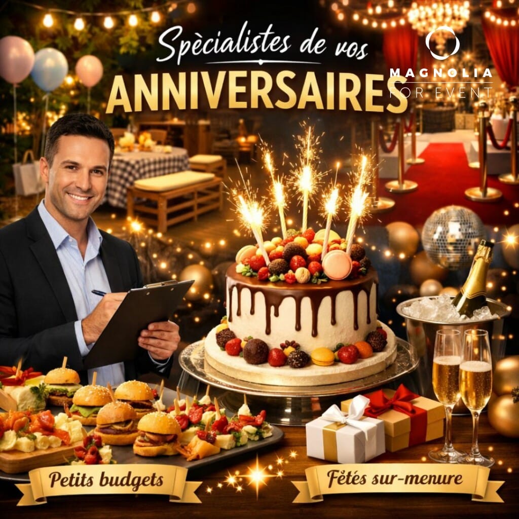 Offrez un anniversaire convivial avec notre formule à 29€ TTC par personne (minimum 25). Profitez d’un cocktail Magnolia de 15 pièces mêlant canapés, wraps, brochettes et douceurs sucrées. Un gâteau au choix avec bougies et fontaines scintillantes complète ce moment festif. Livraison incluse avec plateaux, vaisselle biodégradable, couverts, serviettes et verrerie éco-responsable pour tous vos invités. Tout est pensé pour une organisation simple et pratique, sans matériel à gérer. Cette formule clé en main garantit gourmandise, convivialité et sérénité pour célébrer votre anniversaire et créer des souvenirs mémorables avec vos proches. Plus de renseignements 07 63 66 98 92