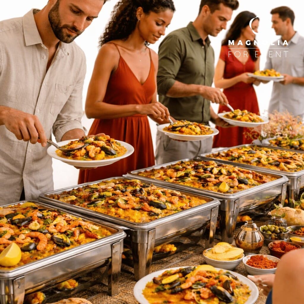 Offrez à vos invités un moment convivial avec notre Paella Party, une expérience culinaire authentique signée Magnolia Traiteur. Colorée, parfumée et généreuse, cette paella traditionnelle espagnole est préparée avec des ingrédients de qualité : riz safrané, poulet, chorizo, fruits de mer et épices maison. Idéale pour anniversaires et événements, elle crée une ambiance chaleureuse et festive. Facile à partager, elle rassemble vos invités autour d’un plat savoureux. Notre formule inclut également la mise à disposition de chafing-dishs, ainsi que vaisselle éco-responsable et glaçons, pour un service pratique et complet tout au long de votre événement.