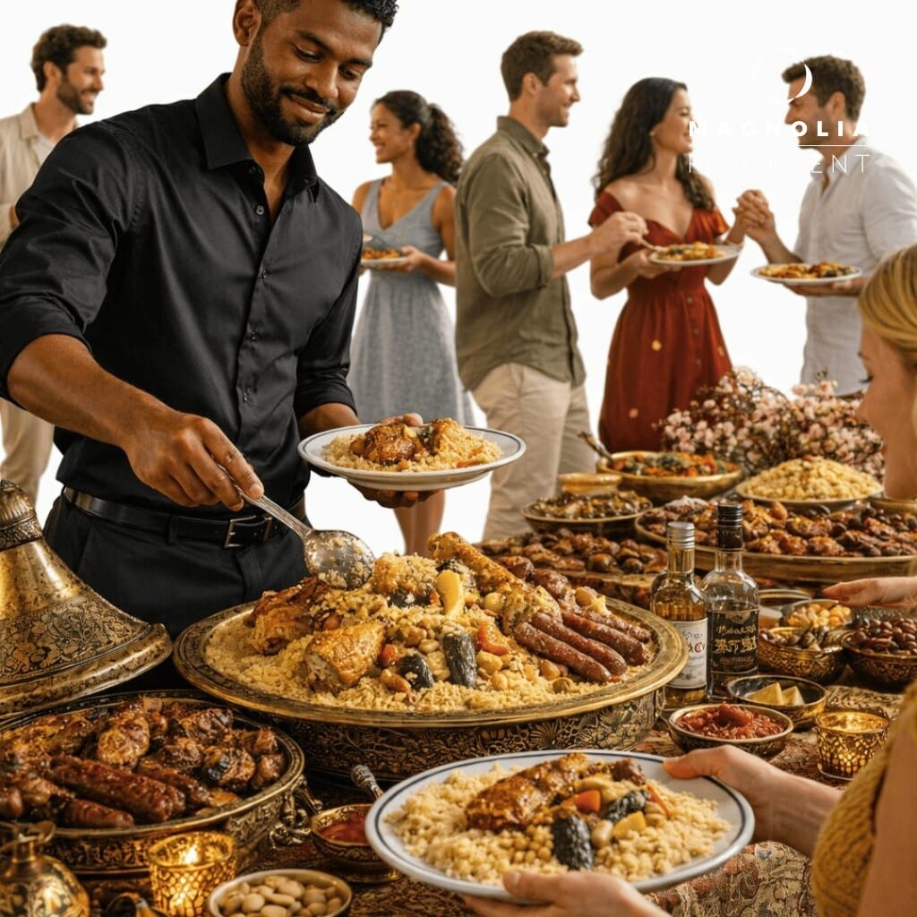 Découvrez notre Couscous Party 3 viandes, une expérience conviviale et généreuse aux saveurs orientales. Préparé maison, ce couscous associe semoule fine, boulette de bœuf, brochette de poulet et merguez, accompagnées de légumes mijotés et pois chiches dans un bouillon parfumé aux épices. Idéal pour tous vos événements, il séduit par son authenticité et sa richesse. Magnolia Traiteur privilégie des produits de qualité pour garantir un moment chaleureux et savoureux. En option, un assortiment de pâtisseries orientales (baklava, makroud, corne de gazelle…) complète parfaitement ce repas et apporte une touche sucrée finale appréciée.